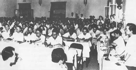 ◆6月8 日,中共中央发出《关于组织力量反击右派分子的进攻的指示》,对反右派斗争作了部署,在全国范围内开展反右派的斗争。图为北京新闻界举行批判右派言论的会议。