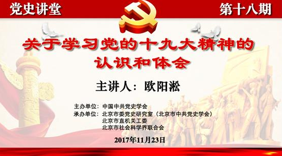 为深入学习宣传贯彻党的十九大精神,2017年11月23日下午,由中国中共党史学会主办,北京市委党史研究室(北京市中共党史学会)、北京市直机关工委、北京市社会科学界联合会承办的第十八期“党史讲堂”在房山区青龙湖镇天湖会议中心举行。全国人大常委、中国中共党史学会会长、中国中共党史人物研究会会长、中央党史研究室原主任欧阳淞同志作题为“关于学习党的十九大精神的认识和体会”的专题报告,北京市直机关工委常务副书记吕和顺同志主持会议。本期讲堂与北京市直机关党务干部学习贯彻党的十九大精神专题研讨班相结合,同时作为研讨班的一次报告会。