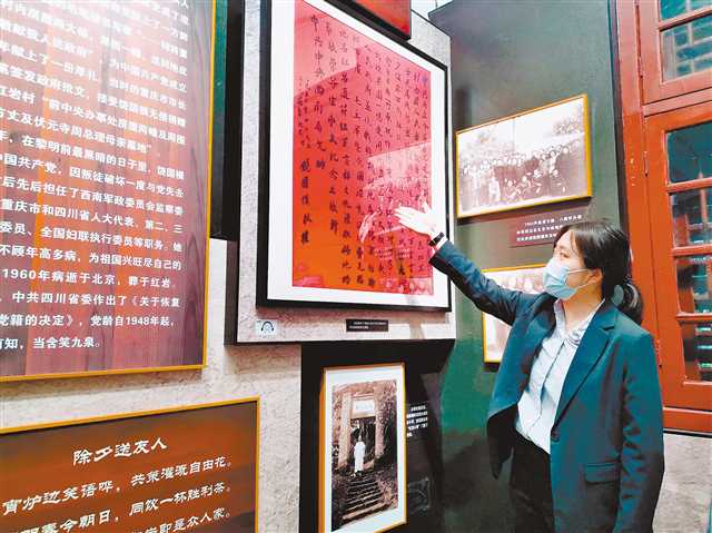 在故居底楼正在举办的“红岩女杰饶国模生平事迹展览”中,记者看到了一件格外醒目的展品,它就是饶国模捐献土地、房屋的红绸信。饶国模在红绸上写到:“……特将重庆市红岩村内房屋两大栋,果园一幅,连同地皮一千方丈敬献我人民政府……”王佩雯说,她每次讲到这里时,都会引得观众赞叹:“这位老太太真了不起!”