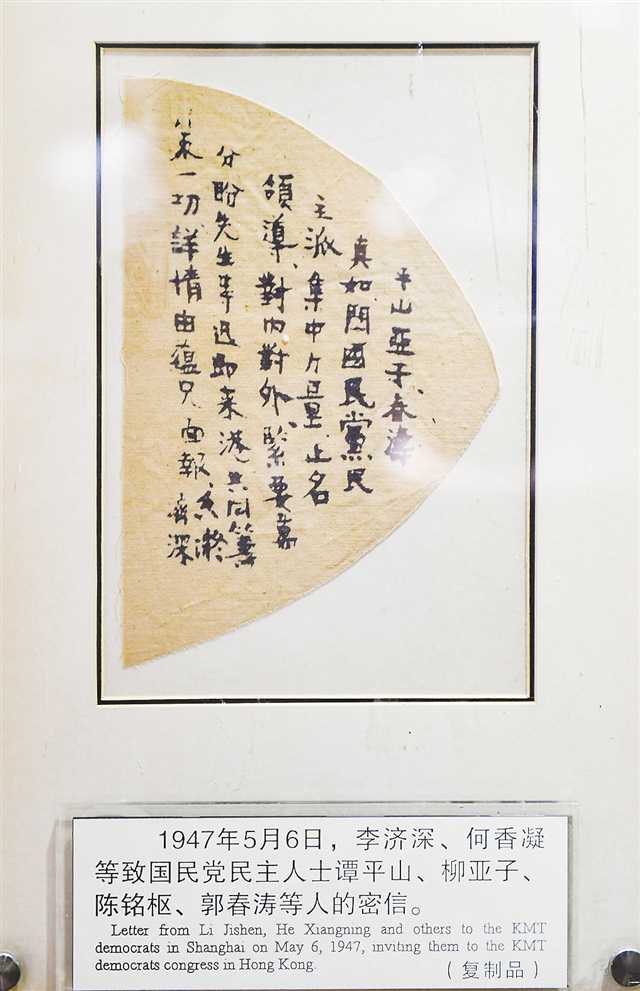 为了联系到民联的同志“迅即来港,共同筹策一切”,李济深、何香凝联名写了这封特殊的信。为躲避国民党军警的严密检查,大家仔细斟酌每一个字词,由李济深在这块白绸巾上写了简明扼要、含义深刻的56个字,将它缝在衣服里面,由朱蕴山带到上海,信尾上就有“详情由蕴兄面报”这句话。
