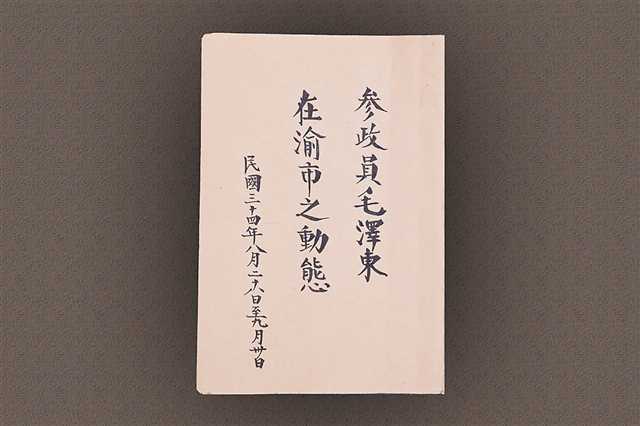 《参政员毛泽东在渝市之动态》是由时任国民政府军事委员会宪兵司令张镇呈报给国民政府军政部部长陈诚的监视报告。“这份报告中,全文抄录了毛泽东1945年8月28日下午飞抵九龙坡机场后的书面谈话一份,记录了8月28日至9月30日毛泽东在渝的详细行程,其中还包含毛泽东在桂园接见、宴请民主人士的情形等。”胡丽说。